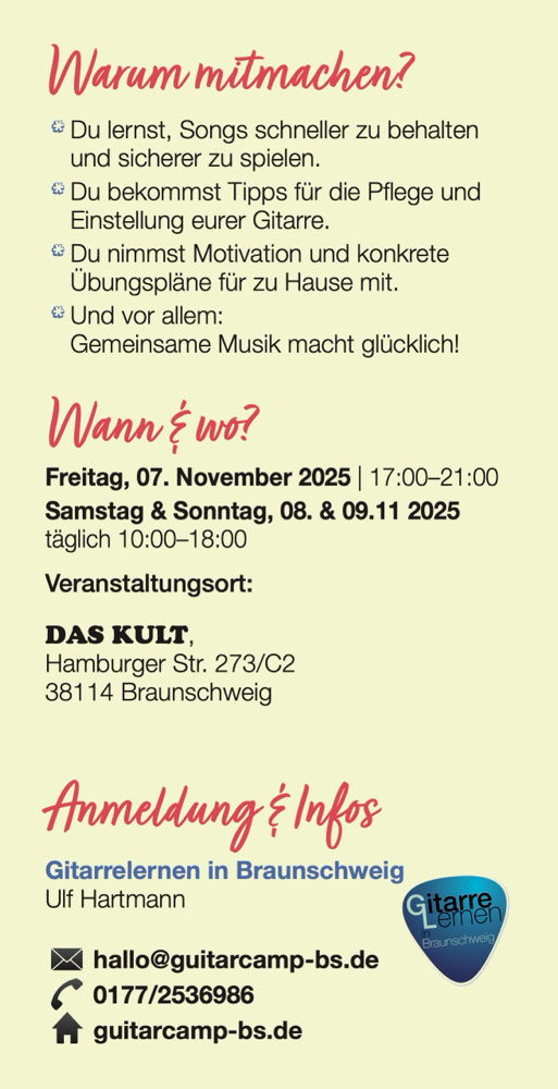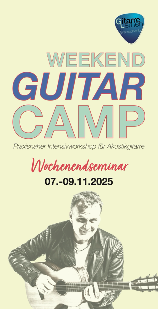 Vom 07. bis 09. November 2025 könnt ihr bei „Gitarrelernen in Braunschweig“ ein besonderes Wochenende erleben! Unser Seminar „Weekend Guitar Camp“ richtet sich an alle, die schon erste Erfahrungen mit der Gitarre haben und ihr Können vertiefen möchten. Egal, ob ihr Anfänger:innen mit Vorkenntnissen oder leicht Fortgeschrittene seid – hier lernt ihr praxisnah, mit viel Spaß und in netter Atmosphäre!
